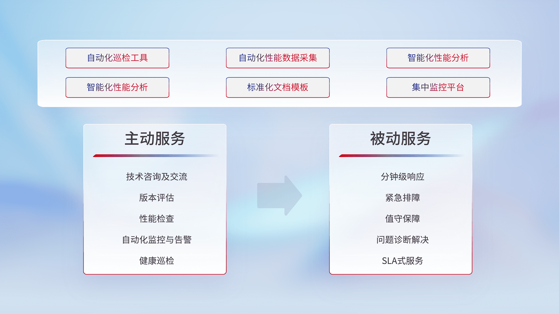 智能化工具和标准化文档,,,,保障服务质量,,提供主动服务(包含技术咨询、、版本评估、、性能检查、、、、自动化监控与告警、、、健康巡检)和被动服务包含(分钟级响应、、、、紧急排障、、值守保障、、、问题诊断解决、、、SLA服务)。。。